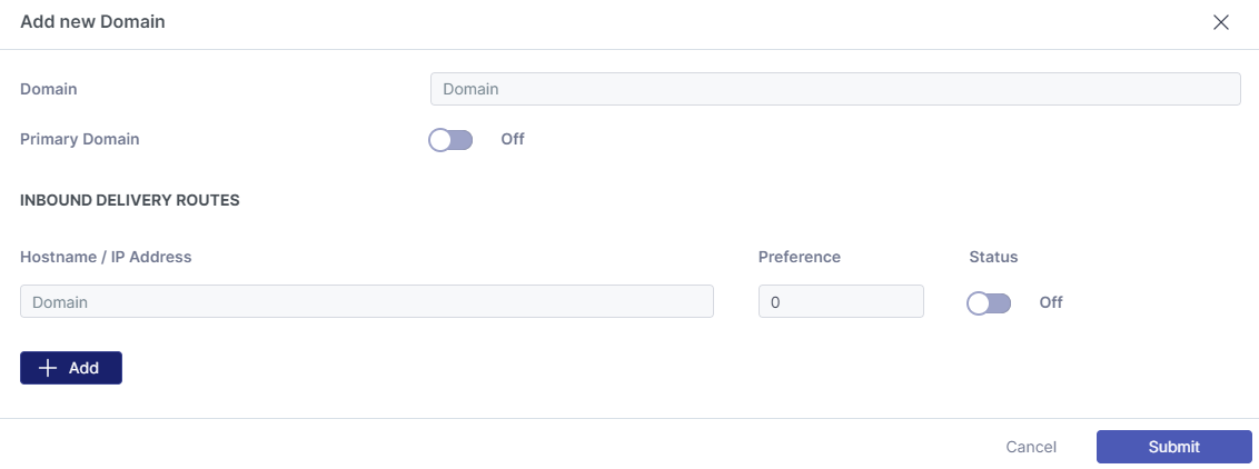 Enter the hostname or IP address for inbound mail delivery. Assign a preference value. Multiple hostnames and/or IP addresses can be added.