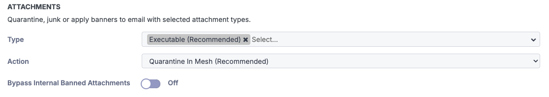 If an email contains an attachment that is part of the selected group, the selected action will be applied.