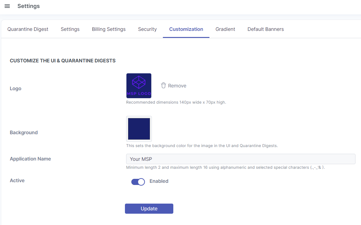 MSPs can add their logo to the portal, which will be displayed at the MSP level, customer level, end-user level, and in quarantine digests. Additional customization features are also available.